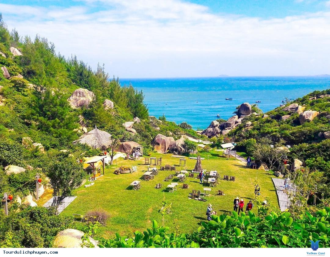 Khu cắm trại với những mái lều canh đỏ nhấp nhô, cả những hàng ghế màu rải rác khắp nơi hướng ngay về phía biển này chính là điểm đặc biệt nhất của cả khu dã ngoại. Cảnh quan ở đây khá hoang sơ với những ghềnh đá vôi nhiều hình thù kỳ dị, bãi cỏ xanh dưới thảm nắng vàng cùng với thứ không khí mặn mòi, trong lành được thổi về từ phía biển chắc chắn sẽ khiến bạn… chẳng còn muốn nghĩ ngợi gì nữa khi tới đây. Buổi tối thì sẽ là một đêm thật vui khi thoả sức ngắm sao, đốt lửa trại, hát hò với đám bạn của mình…