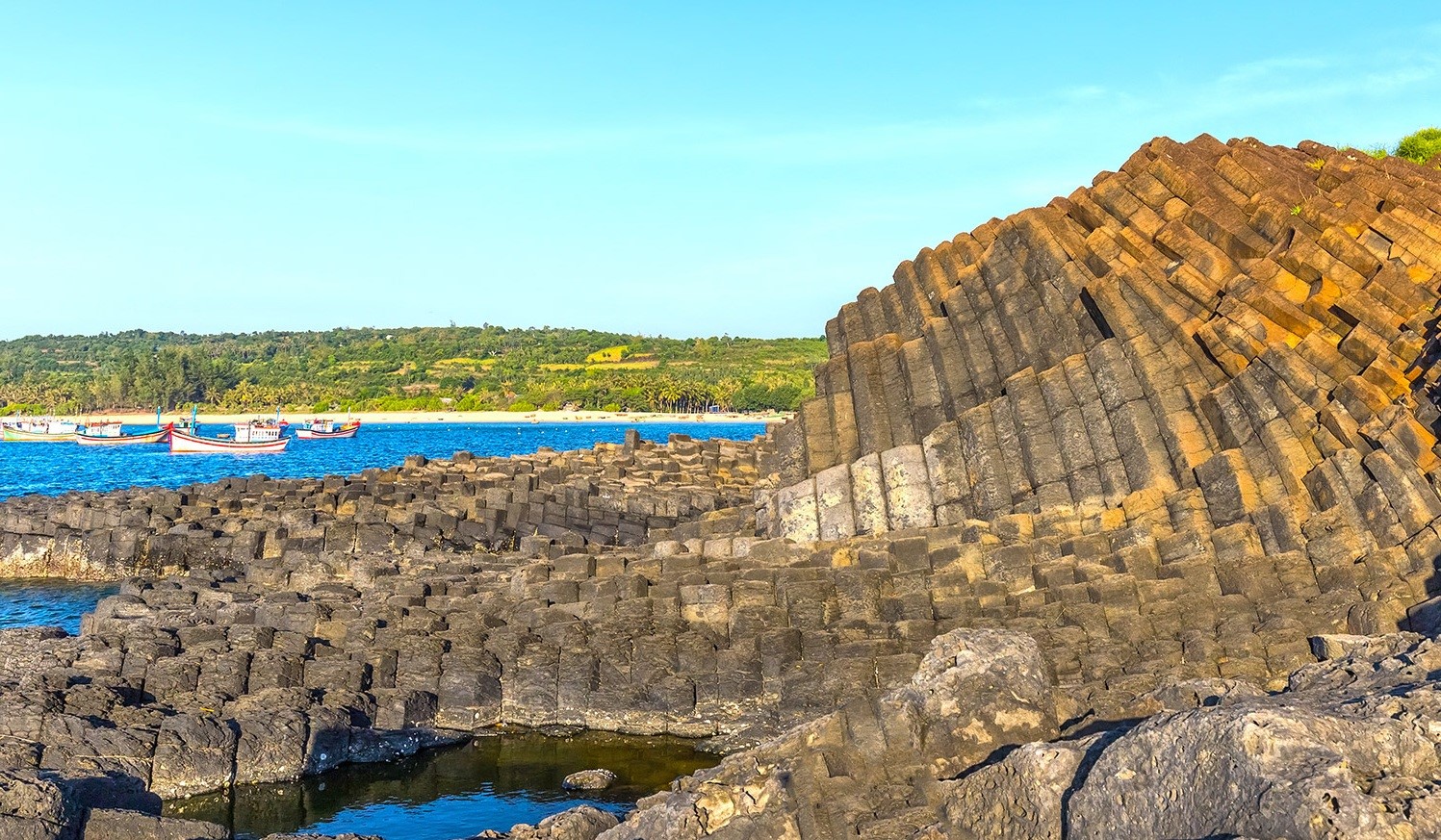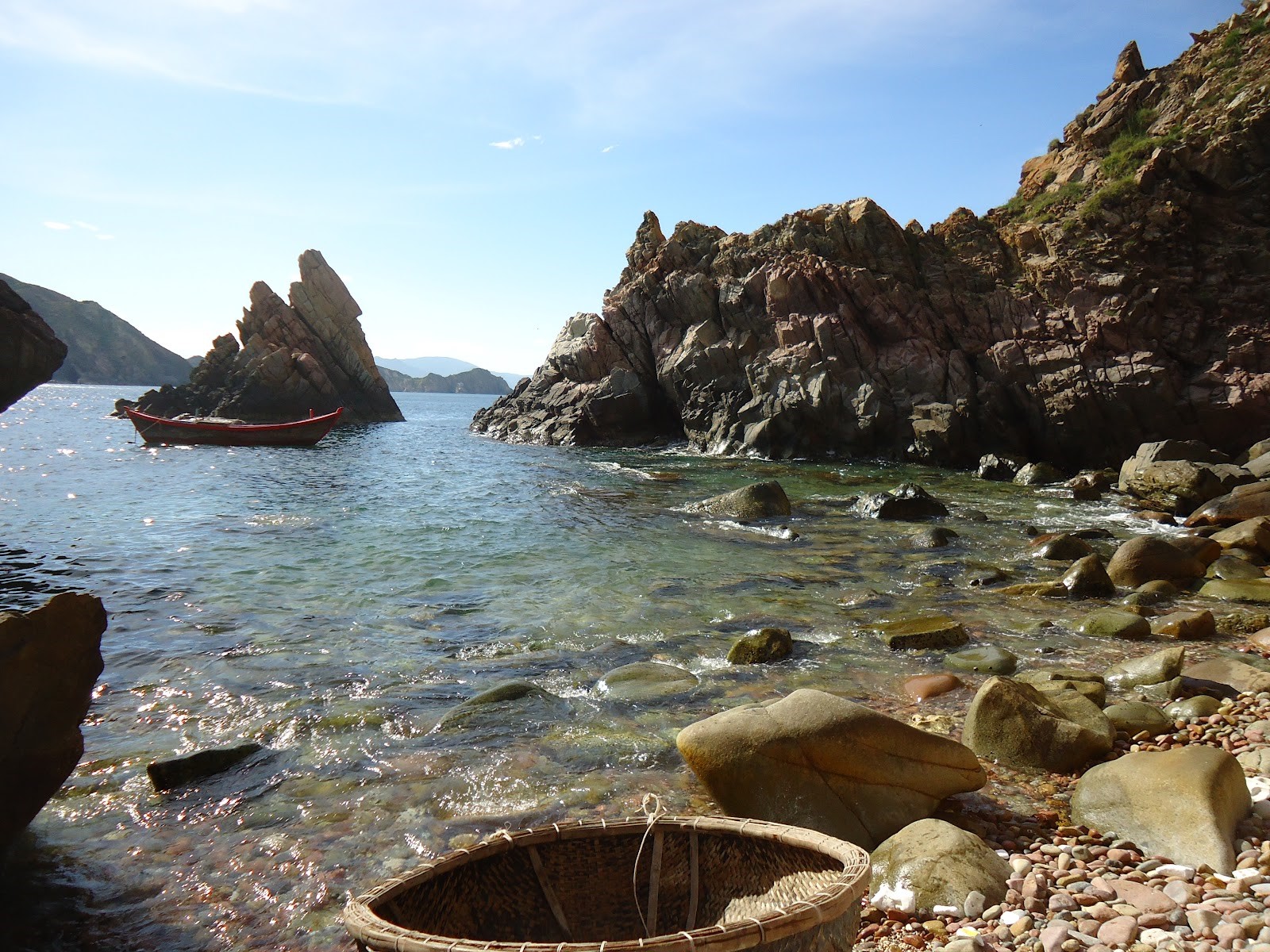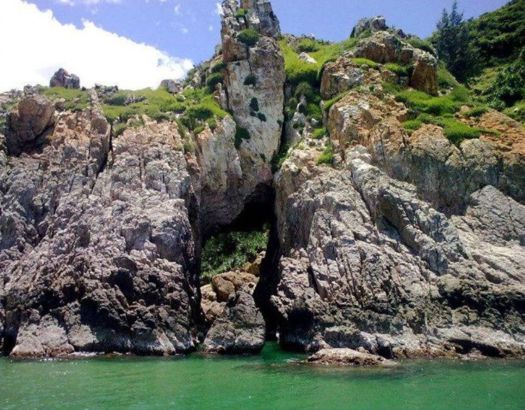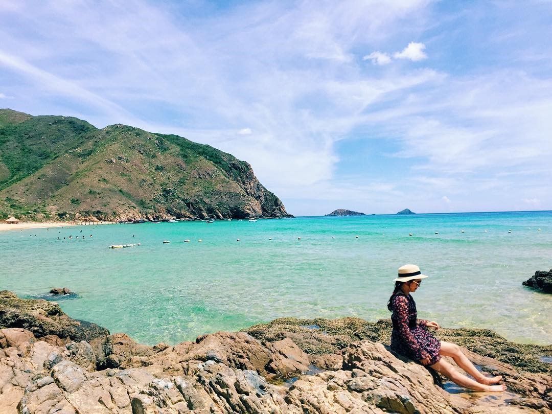 Ngồi trên những tảng đá, gió lồng lộng thổi hòa cùng vị mặn mà của biển. Ngắm núi, ngắm biển và ngắm những đợt sóng đánh vào gành đá tạo bọt trắng xóa. Xa xa là những con thuyền của ngư dân. Một bức tranh thiên nhiên đẹp hùng vĩ.